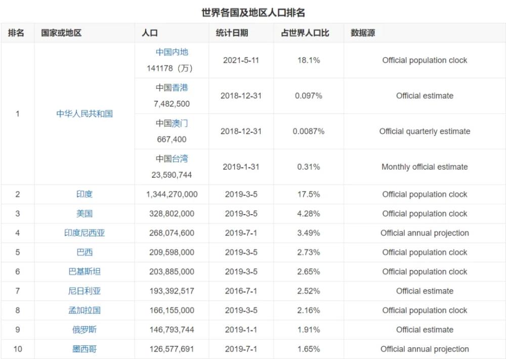 世界各国人口排名(List of World's populations)最新的世界各国及地区(包括主权国家,有人居住的附属领土等)的人口排行榜。这份排行榜使用的数据是基于国家人口普查当局提供的统计数据以及联合国经济和社会事务部人口司对2019年的预测数据。截止到2019年3月,世界人口排名前10的国家有中华人民共和国(含港澳台)、印度、美国、印度尼西亚、巴西、巴基斯坦、尼日利亚、孟加拉国、俄罗斯、墨西哥。