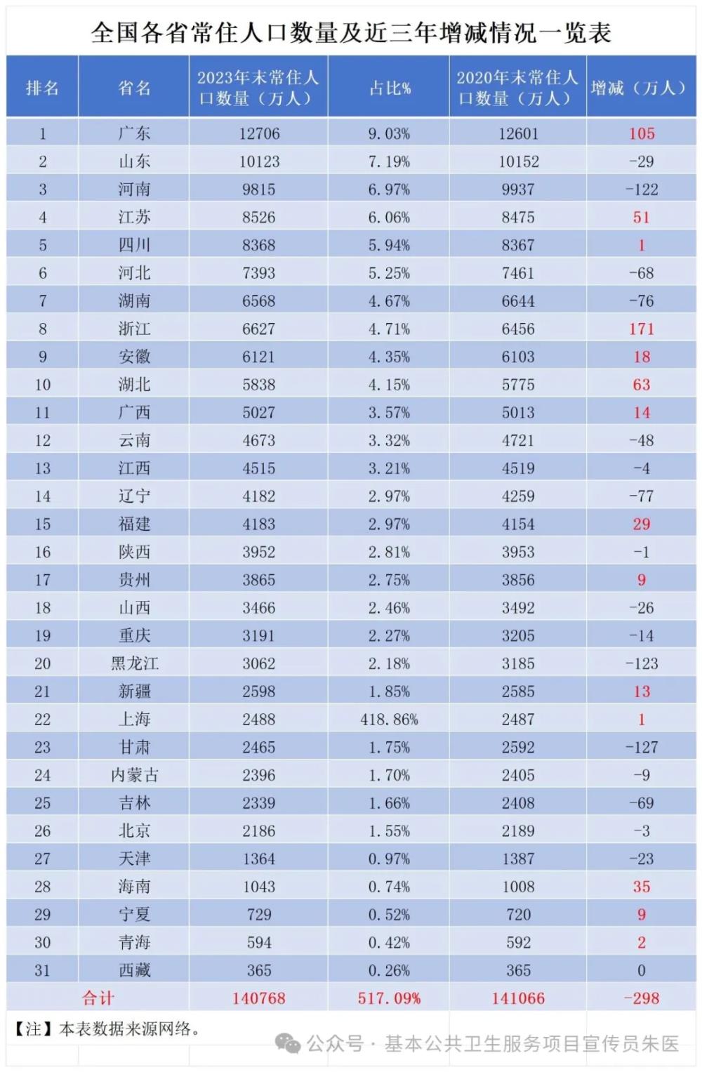 一起来看看全国各省(直辖市、自治区)常住人口数量、排名及增减情况吧。