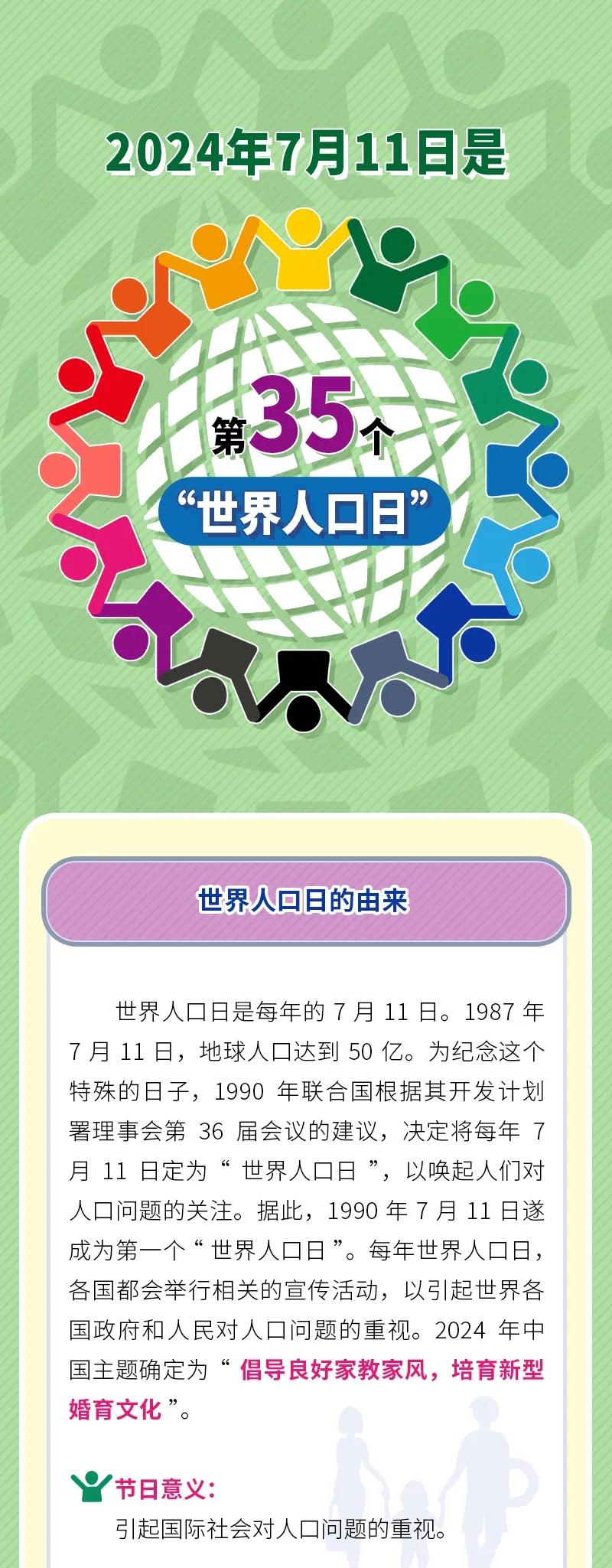 1987年7月11日,地球人口达到了50亿。为纪念这个特殊的日子,1989年联合国发展规划署理事会建议国际社会把每年的7月11日定为世界人口日(World Population Day)。1990年联合国根据发展计划署理事会第36届会议的建议,决定将每年7月11日定为“世界人口日”,以唤起人们对人口发展与资源环境的关注。据此,1990年7月11日遂成为第一个“世界人口日”。每年的7月11日世界人口日,各国都会举行相关的宣传活动,以引起世界各国政府和人民对人口问题的重视。