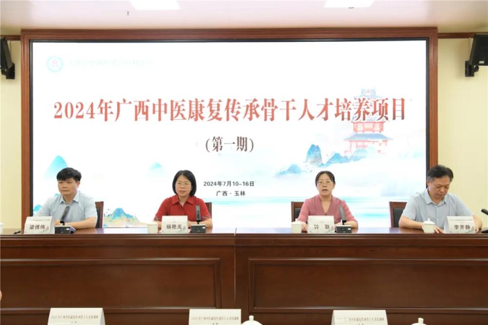 7月11日至16日,由自治区中医药管理局主办、玉林市中西医结合骨科医院承办的2024年广西中医康复传承骨干人才培养项目第一期培训班在我院举办。自治区中医药管理局科教处杨艳光处长,玉林市卫生健康委员会党组成员、总会计师钟耿,玉林市中西医结合骨科医院党委副书记、院长梁博伟,玉林市中西医结合骨科医院副院长李开静出席开班仪式,来自全区各医疗机构60名中医康复骨干人才培养对象参加培训。开班仪式由李开静副院长主持。