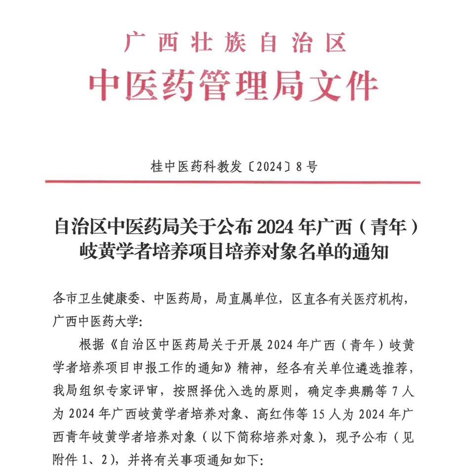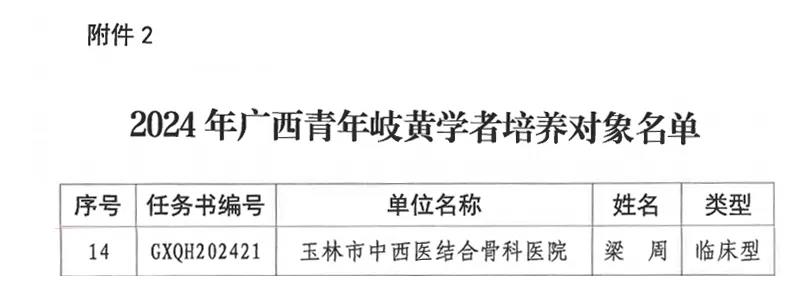 近日,广西壮族自治区中医药管理局发布《关于公布2024年广西(青年)岐黄学者培养项目培养对象名单的通知》,其中,玉林市中西医结合骨科医院梁周博士入选广西青年岐黄学者培养对象。